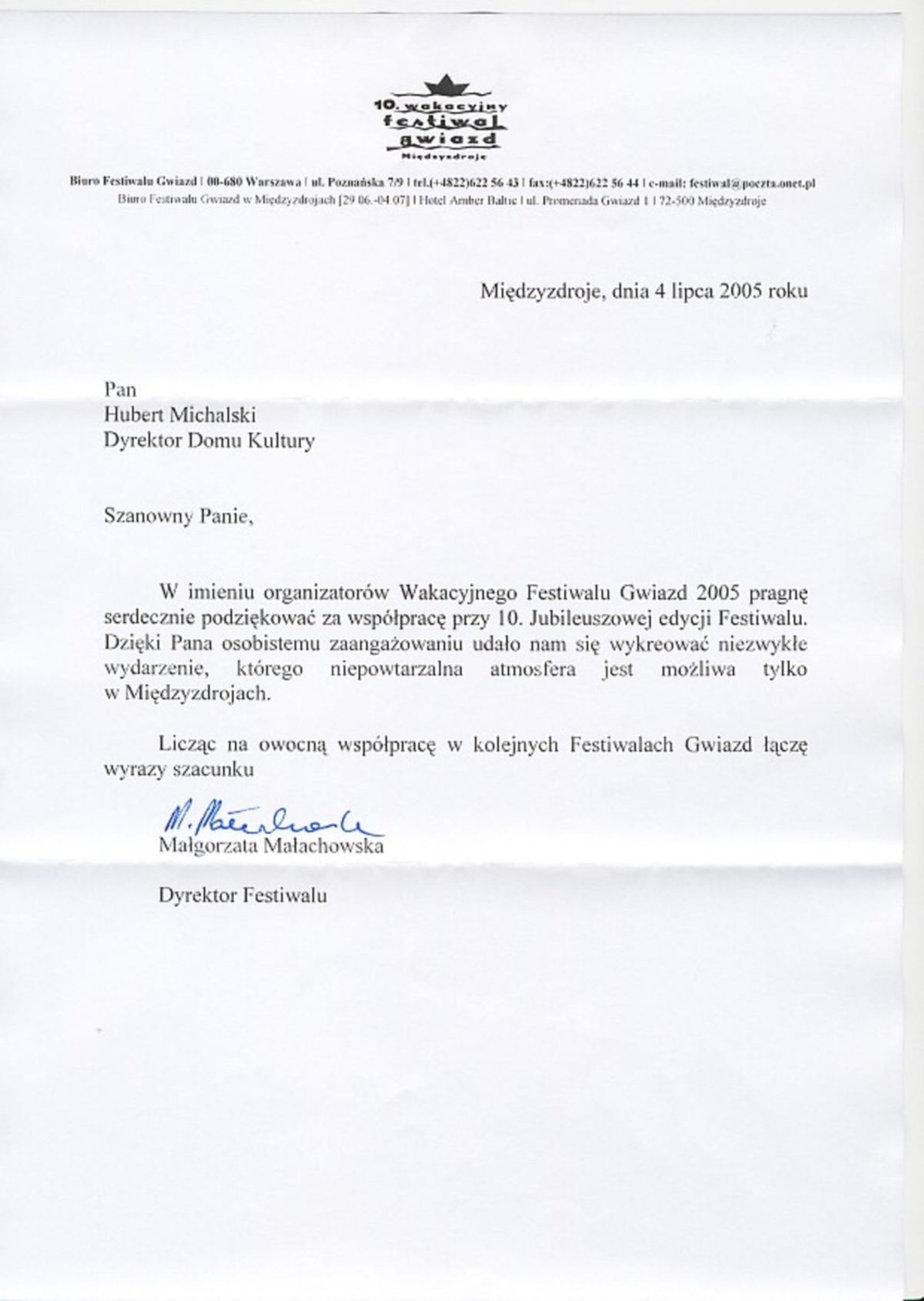 Podziękowania dla Pana Huberta Michalskiego za pomoc w X Wakacyjnym Festiwalu Gwiazd