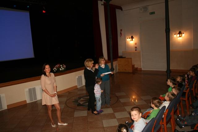 Spotkanie zaczęło się od uroczystego wręczenia na ręce Dyrektora MDK, Pani Jadwigi Bober Statuetki „Przyjaciel Przedszkola”. Statuetkę wręczyła Dyrektor Przedszkola Miejskiego „ Morskie Skarby’, Pani Elwira Korcz wraz z przedszkolakami.